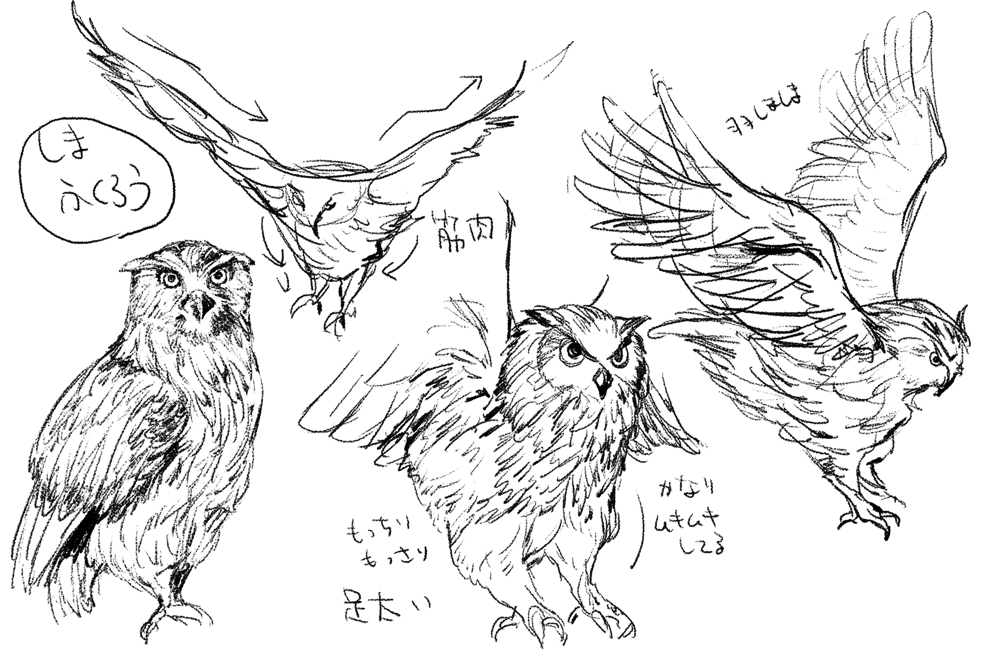 動物ラフ その他イラスト 2022年12月13日 次回のデザフェスでふくろう描きたいなと思って練習。正直な話、格好良いけど実物はちょっとディテールが怖いというかグロテスクだなと思ってたのですが最近可愛いと思えるようになりました